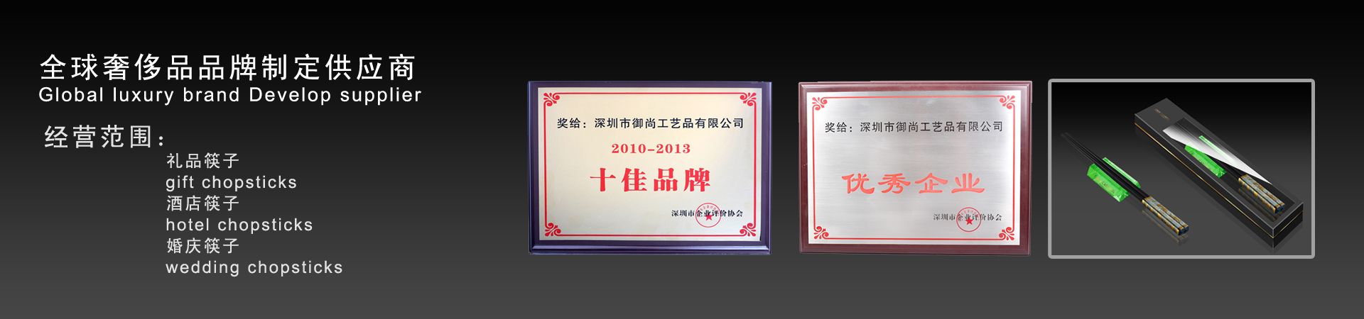 御尚健康產(chǎn)業(yè)(深圳)有限公司旗下御尚工藝筷子榮獲深圳市企業(yè)評(píng)價(jià)協(xié)會(huì)授予的2013年度“優(yōu)秀企業(yè)”和年度“十佳品牌獎(jiǎng)”稱號(hào)。 深圳市御尚工藝品前身為深圳市御尚工藝筷子廠,是御尚健康產(chǎn)業(yè)(深圳)有限公司和香港御尚實(shí)業(yè)有限公司全資子公司,是一家專業(yè)從事高檔筷子及紅木工藝品設(shè)計(jì),研發(fā)和銷售及生產(chǎn)為一體的專業(yè)供應(yīng)商,位...【更多詳情】